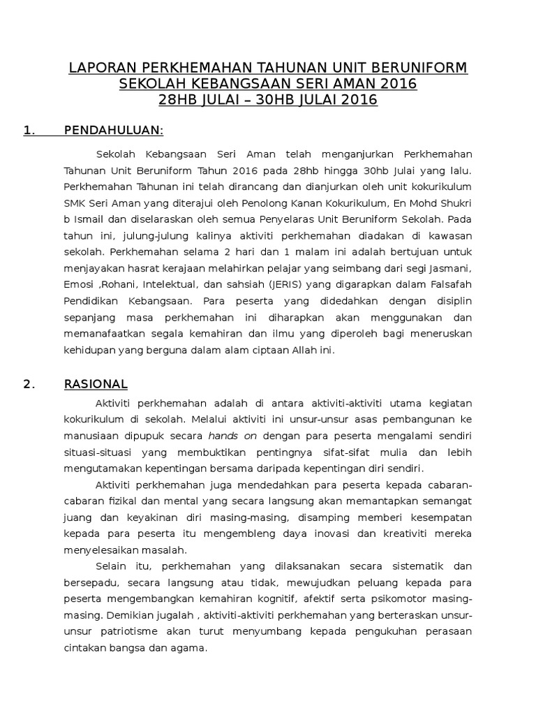 30 Full PDFs related to this paper. Laporan Perkhemahan Unit Beruniform Sekolah 2013 Shuhada Osman. Perkhemahan unit beruniform adalah salah satu saluran pendidikan luar bilik darjah yang amat berkesan dalam usaha menangani segala bentuk.